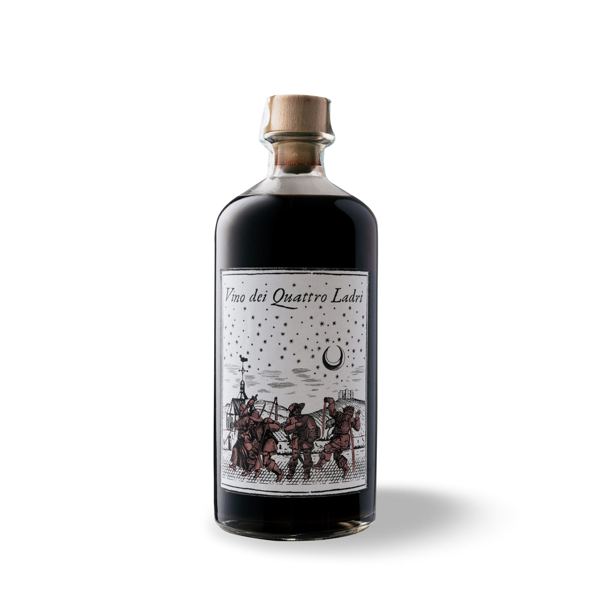 Ispirato all’antica leggenda dei quattro ladri e del loro magico infuso di piante medicinali escogitato come antidoto per sfuggire al contagio della peste. Una pregiata mistura di erbe e spezie conferisce seducenti note amaricanti e soavi al Nero di Troia fortificato con brandy secondo tradizione, dando vita ad un connubio dal profilo intenso e ricco dei caratteristici profumi mediterranei di Provenza e delle terre murgiane.
